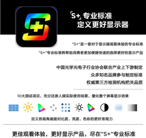 据了解,显示器市场存在诸多不同品牌的显示器产品即使规格相同,观看效果也参差不齐的“标”里不一问题。为提升用户视觉效果,帮助消费者买到更好的显示器产品,在《液晶显示器件视场光学性能测试方法》团体标准的基础上,结合用户需求和市场反馈,京东携手中国光协以及多家品牌,打通了技术端和需求端各资源要素,推出以消费者视觉体验出发的“S+认证标准”在京东落地。显示器产品通过了S+专业标准的认证,即意味着这台显示器不仅能够满足显示器的各项基础规格,同时屏幕均匀性也非常优秀,拥有优良视觉体验,是值得消费者选择的好产品。