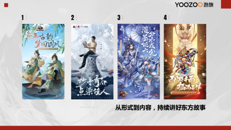 游族注重发掘传统文化的内涵与价值,以游戏为载体,不断地将传统文化与东方哲学融入到游戏作品中。在少年系列IP游戏中,以《少年三国志》为例,将三国作为背景,以“少年精神”为内核,向全球玩家阐述三国历史,对传统故事和精神进行了当代化演绎。而在东方神话回合制RPG手游《山海镜花》中,以《山海经》和《镜花缘》为背景,通过对上古历史的考证,对山川地势、奇珍异兽、神话异闻的借鉴与融合,打造出了一个奇幻的“大荒世界”。此外,游族也通过跨界联动的形式,多款产品与敦煌博物馆、青花瓷、脸谱、蜀绣、京剧、孔明锁等非遗IP深度联动,将丰富的国风元素融入游戏。