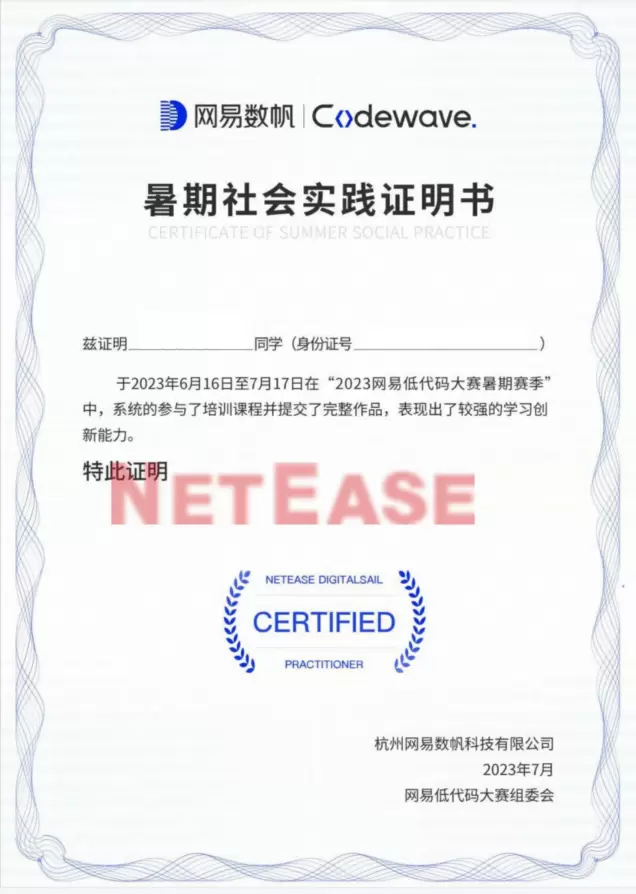 在此背景下,网易数帆设立网易低代码大赛,基于智能大模型,全栈低代码理念的CodeWave智能开发平台,以赛促学,推广并普及低代码开发技术,培育新一代的应用开发人才。秉承赛事设立初心,本次暑期赛季不仅兼顾高校学生、个人开发爱好者、企业IT人员不同人群,开辟“高校”和“企业”两条赛道,还针对“小白”选手提供完整线上“全程班”培训课程,包括“在线开班训练”理论课程和“应用实操直播课”实战课程等近80堂课程,为选手提供开发实践指导,帮助选手逐渐成长为一名真正的低代码开发人才。同时,本次比赛还提供实践证明、官方认证等支持,比赛期间就有超过300名参赛学生获得暑期实践证明。赛后,高校赛道一等奖获奖选手全景芳也谈到:“通过本次比赛对低代码有了新认知,拓宽了自己视野。比赛结束后,我会在学习专业知识的同时,持续关注低代码,探索低代码的更多新可能。”