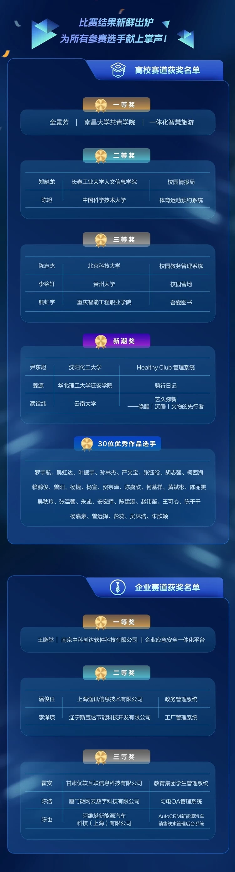 值得注意的是,大赛联合网易沈阳数字产业中心、共青城网易联合创新中心等园区,与本地多个高校合作,为本次大赛输送了不少低代码开发者人才,高校赛道的选手中不仅有来自中科大、厦门大学等重点高校,同时也有来自重庆智能工程学院、遂昌县职业中等技术类院校。这也证明着低代码让人才选用的范围更广,能够为更多的人提供职业上的新可能。