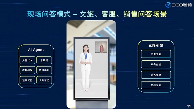 梁志辉展示了360AI数字人在会议演讲、电商直播、智能客服、文旅讲解、销售问答等场景的应用。他表示:我们可以快速生成数字分身、品牌和城市代言人,做到看得见、听得懂、说得好,可以与用户进行自然的交互,不仅能学会你的说话方式,还能代替你完成客服、销售、直播、培训工作甚至是出席重要活动。