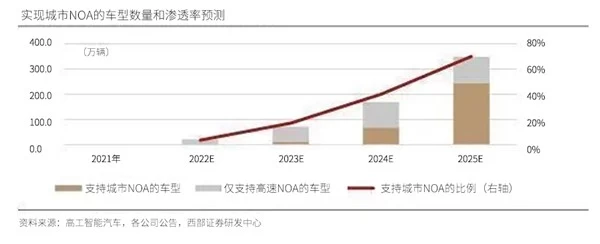 据西部证券预测,2023年搭载城市NOA的汽车总量或将为70万辆,2025年可能将达到348万辆,其中支持城市NOA功能的车型占比将从2023年17%迅速上升到2025年的70%。目前,城市NOA国内玩家主要为“蔚小理”、长城、吉利、上汽、广汽、北汽、赛力斯和长安等车企或其控股零部件公司。