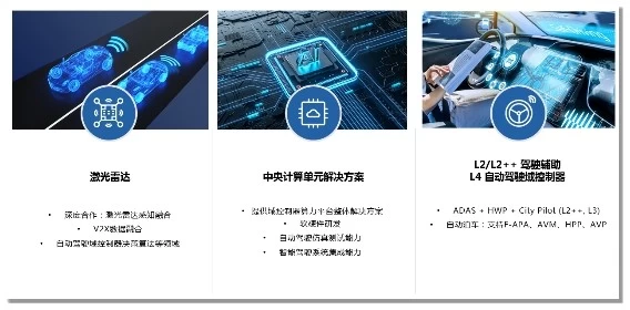 均胜电子公司近年持续推动人工智能与汽车产业的融合,推进高算力智能驾驶域控制器、智能网联系统等的研发及商业化,具备包含L2、L3、L4等智能驾驶研发能力,提供从底层研发到规模化量产的“软硬一体”解决方案。目前,公司与英伟达、高通、地平线、黑芝麻等芯片厂商建立合作关系,并与国内外多家整车厂商推进共同研发。