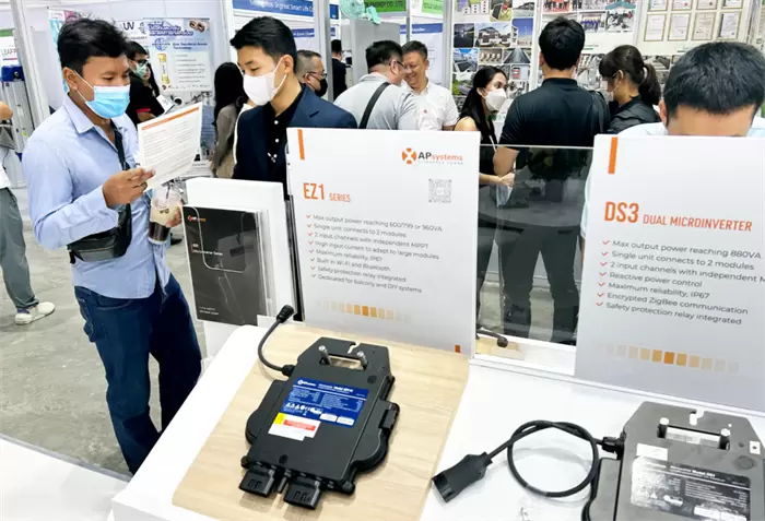此次亮相ASEAN的Wi-Fi+蓝牙双通信模式微型逆变器EZ1系列产品,是昱能科技针对阳台等DIY场景,全新推出的微逆产品,拥有Wi-Fi及蓝牙双通信模式,并且在外观、性能等方面实现了进一步提升,此次也是该款产品首次亮相东南亚市场,吸引了众多参会人员的围观。