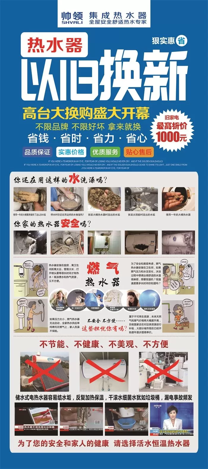 本次帅领以旧换新家电大促,是针对旧房装修改造推出的一项超值优惠,通过拆除太阳能、安装帅领集成热水器,每户家庭可享受800-1500元不等的福利补贴,极大幅度提振家电市场消费信心,让品质热水走进千家万户。