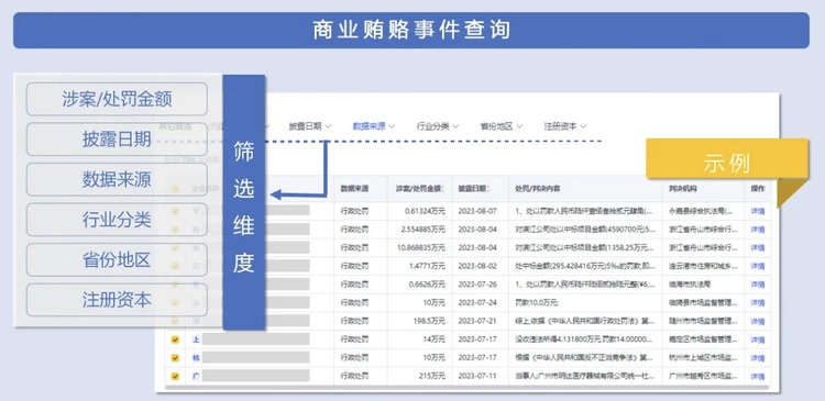 医药、医疗领域风腐问题不断隐形变异,行贿受贿手段不断迭代更新,“定制式”招投标、“规避式”委托采购等医疗腐败潜藏于药企合作的各环节中。其中,商业贿赂、招投标也是合规风控问题的高发区。基于启信慧眼平台的多维度的信息排查板块,相关企业可以在准入阶段完成对意向合作方的信息排查及利益冲突排查,并通过查看其是否有历史违规记录及处罚判决内容辅助决策,在准入环节保证企业采购的合规性。