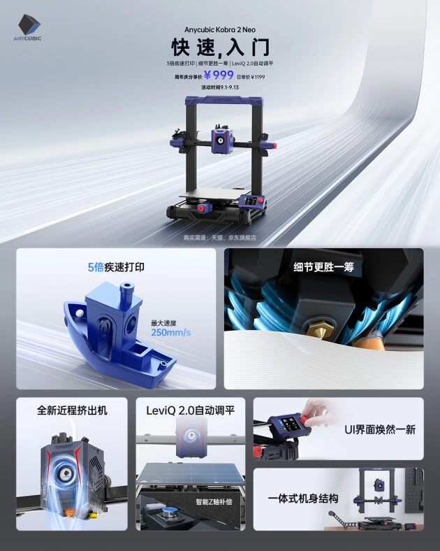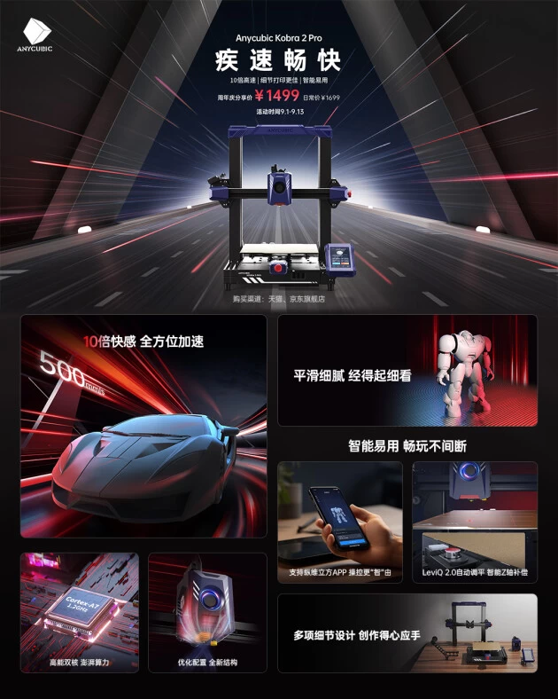 目前,这四款新品均已在纵维立方官方天猫、京东旗舰店开售,趁着A-Creators Fest周年庆狂欢,每款新品都有优惠价!Anycubic Kobra 2 Max周年庆分享价¥2599、Anycubic Kobra 2 Plus 周年庆分享价¥1999、Anycubic Kobra 2 Pro周年庆分享价¥1499、Anycubic Kobra 2 Neo周年庆分享价¥999,狂欢时间从今日起至9月13日,感兴趣的小伙伴现在就可以进店加购了。