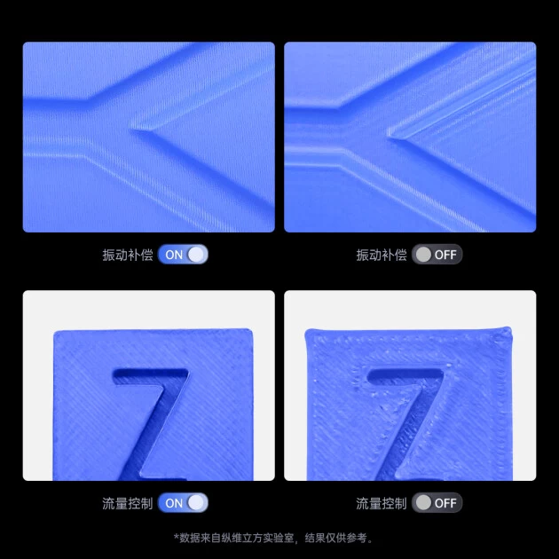 在高速打印下,也有高质量表现!一键振动补偿,通过内置加速度计模块检测X/Y轴共振频率,对运动控制进行智能调整,有效消除共振竖纹、括号纹,保证打印精度及稳定性。通过“流量控制”智能补偿回抽回填,确保每层均匀且充实打印,提升打印品质和细节展现。