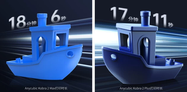 打印速度飙升10倍、拥有着420*420*500毫米巨型打印尺寸的Anycubic Kobra 2 Max与320*320*400毫大打印尺寸的Anycubic Kobra 2 Plus,对于追求高速与大尺寸打印的用户而言无疑是理想型新选!推荐打印速度提升至300mm/s、至高打印速度达500mm/s以及1000mm/s²至大加速度,Anycubic Kobra 2 Max仅需18分钟6秒、Anycubic Kobra 2 Plus仅需17分钟11秒即可完成标准小船模型的打印。