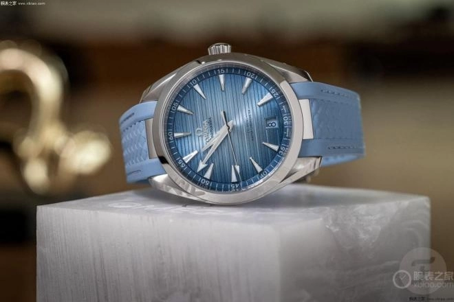 镀铑指针和小时刻度均覆以浅蓝色Super-LumiNova夜光涂层。夜光涂层比表盘色调浅得多,形成了很好的对比。与常规41毫米Aqua Terra表款一样,日历窗位于6点位。日期盘的配色与表盘相呼应,紧扣“Summer Blue”主题。41毫米表款可搭配常用的精钢表链或浅蓝色橡胶表带。浅蓝色表盘和浅蓝色橡胶表带的组合,真是夏日气息满满。
