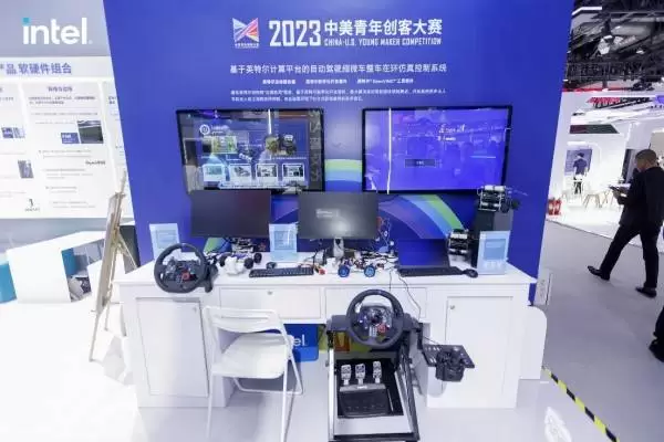 在英特尔展台,来自上海交通大学的“基于英特尔计算平台的自动驾驶缩微车整车在环仿真控制系统”吸引了参会观众驻足。它历时6个月完成,同时获得了“2023中美青年创客大赛” 总决赛一等奖及大赛英特尔特别奖两个奖项。