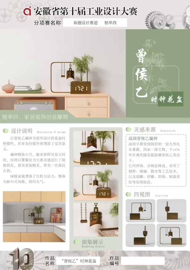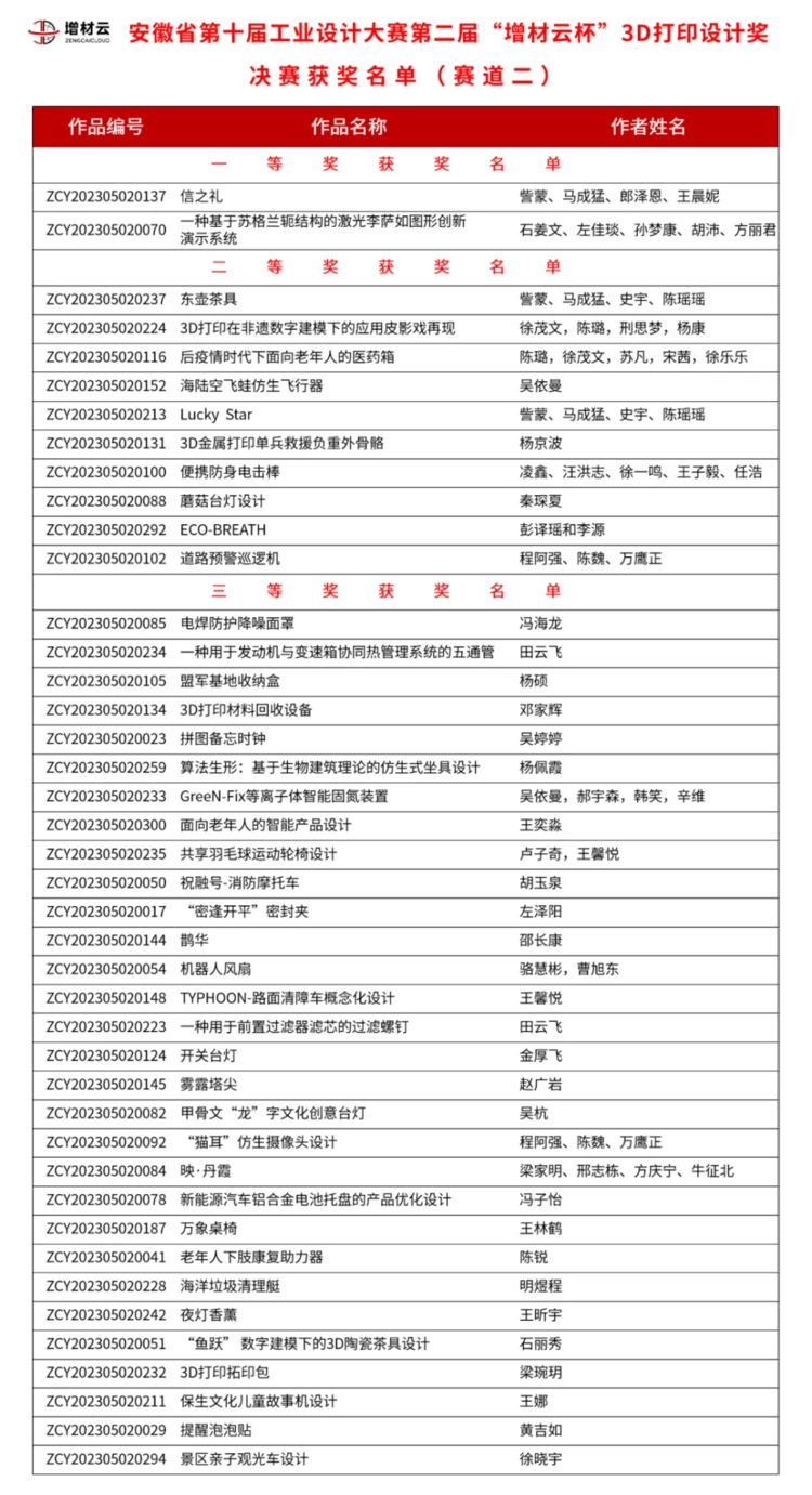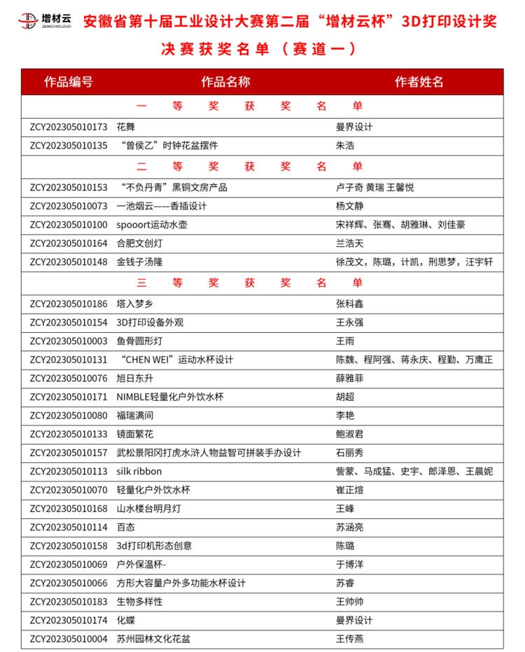 活动的最后大家进行了合影留念。安徽经济报社和增材云视频号同步进行了线上直播,吸引了许多工业设计师、相关行业从业人员、3D打印爱好者进入直播间,在线上“围观”了本次赛事。浏览量超10万人次。本次安徽省第十届工业设计大赛第二届“增材云杯”3D打印设计奖分项赛,获奖作品共计68件,优秀指导老师10名,优秀组织奖11名。其中《“曾侯乙”时钟花盆摆件》,曼界设计的《花舞》等4件作品获得了一等奖,《spooort运动水壶》、《东壶茶具》、《山水楼台明月灯》等15件作品获二等奖,《旭日东升》、《提醒泡泡贴》等49件作品获三等奖。具体获奖名单见下方表格。
