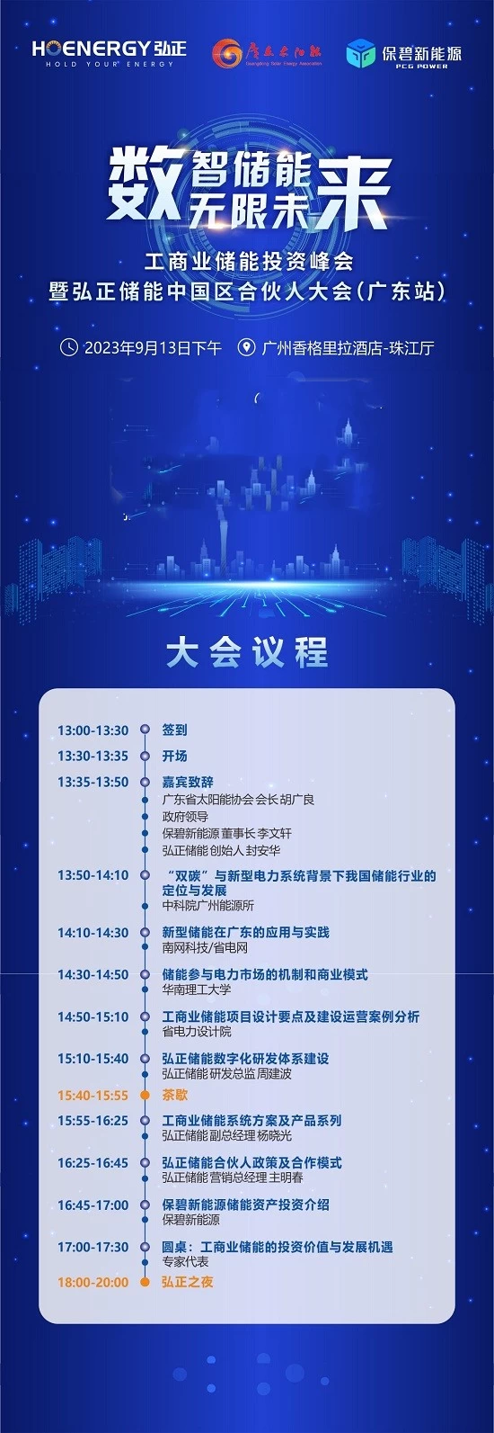 2023年9月13日,由弘正储能、保碧新能源、广东太阳能协会联合主办的工商业储能投资峰会暨弘正储能中国区合伙人大会(广东站)将在广州香格里拉盛大举行。本次弘正储能中国区合伙人大会以“数智储能 无限未来”为主题,旨在加强与各界专家同仁交流合作,携手助力储能产业蓬勃发展。