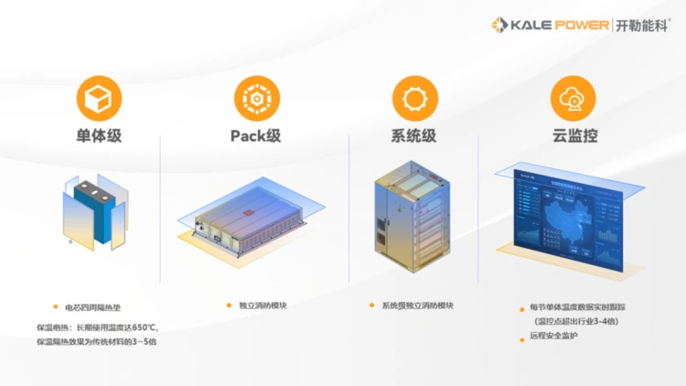 而此之外,开勒还为储能系统设计了PACK级独立消防模块,系统级独立消防系统,以及云平台温度安全监测防护设计,配合全液冷散热系统,共同守护储能设计安全稳定运行。