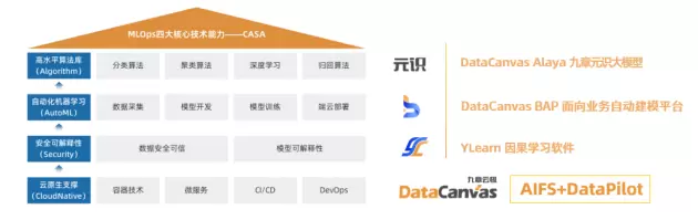 IDC还提炼出MLOps工程引擎四大核心技术能力,分别是:高水平全场景算法库、全栈式AutoML自动化机器学习、数据模型安全可解释、云原生技术支撑。九章云极DataCanvas的AIFS人工智能基础软件和DataPilot数据领航员产品体系全线产品均以云原生基础构建,自主研发的白盒Alaya元识大模型矩阵、BAP面向业务自动建模平台、YLearn因果学习软件等独立产品更匹配各项突出的核心技术能力。
