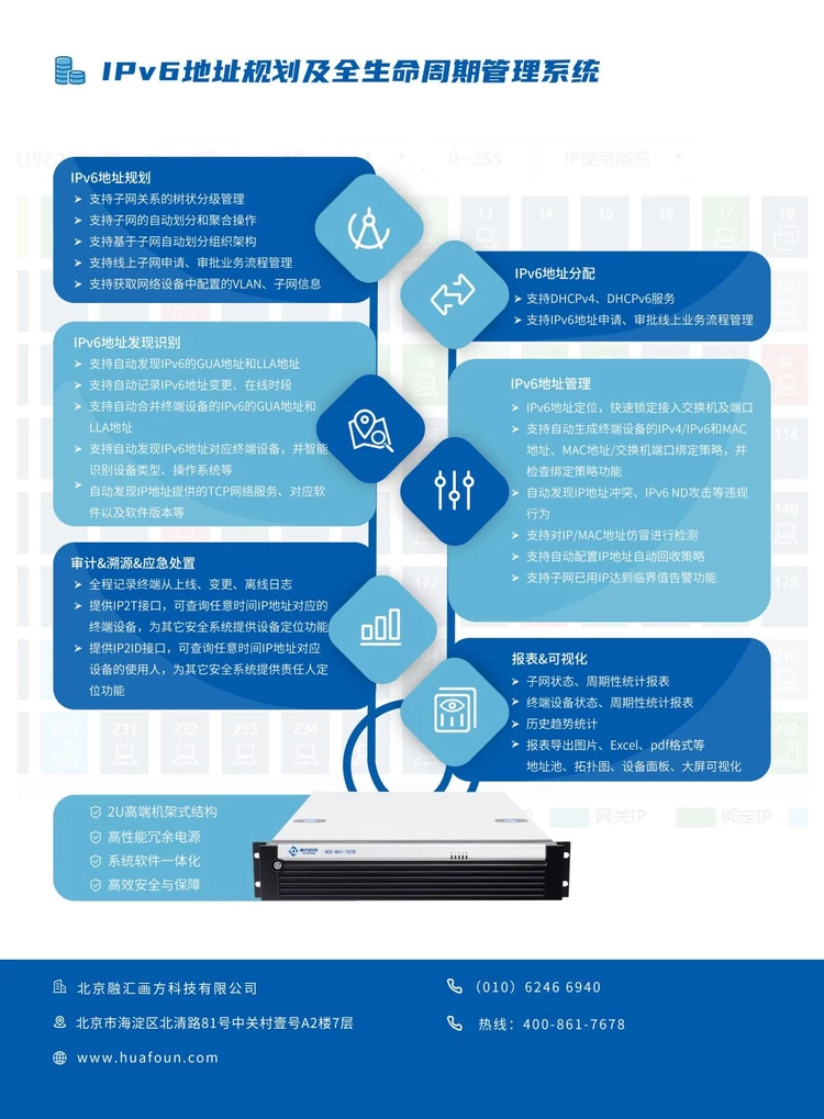 近日,北京融汇画方科技有限公司(以下简称画方科技)推出IPv6地址规划及全生命周期管理系统(以下简称IPv6管理系统),简化用户IPv6地址管理难度,提升管理效率。画方IPv6管理系统提供IPv6地址的规划、申请、审核、分配、变更、监测、告警、回收、审计等全生命周期管理,可全方位记录IP地址的网络日志,提供基于IP地址定位终端设备、定位责任人的实时和历史溯源数据,提高用户在风险和责任定位问题上的响应能力。系统通过可视化方式实时展示网段、IP地址、终端设备的画像,在可视化界面中进行操作,简单易用、直观清晰,并提供丰富的统计报表,可对在线、历史IP的使用情况进行详细的统计分析。