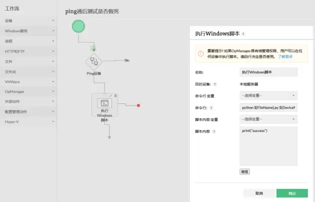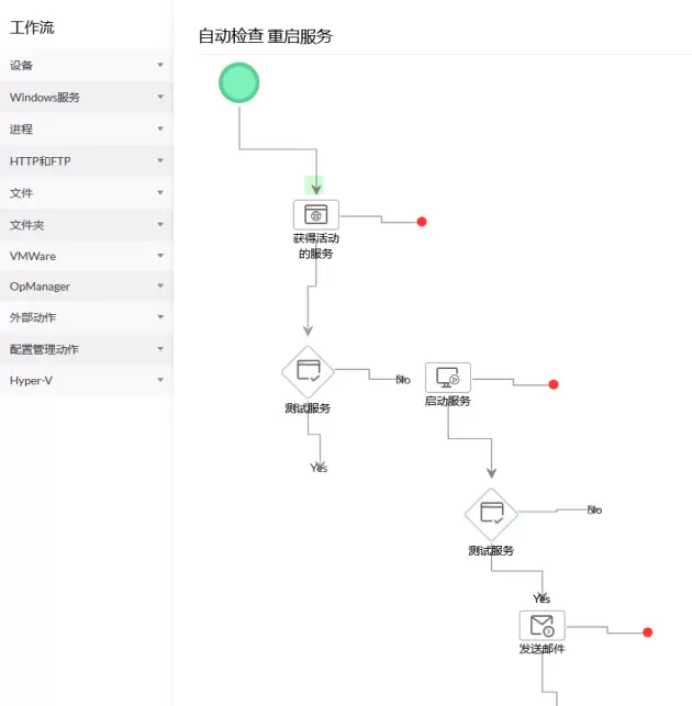 对于IT运维人员来说,配置自动化IT管理可以不再浏览复杂的脚本和代码。因为OpManager的IT工作流自动化采用友好的用户接口,并免除编码的设计,能够快速构建工作流规则。所以运维人员可以在直观的流构建器中,通过简单的拖放操作,即可创建工作流程。这么说很难让大家有直观的感受,给大家举几个工作流场景。