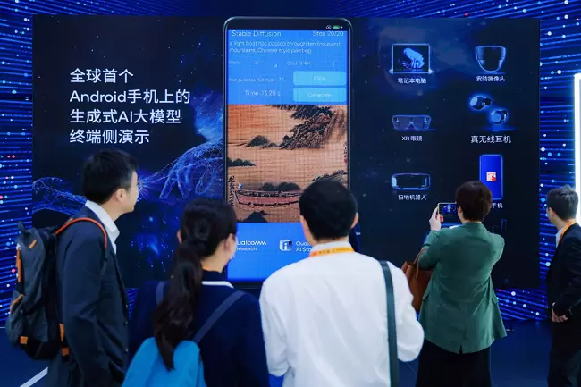 通过混合AI架构,将一部分算力分配到终端侧运行,挖掘海量终端侧设备的算力资源,是生成式AI克服成本问题,实现AI快速扩展到全球更广范围的关键。随着智能手机、个人电脑等终端设备的升级,终端侧AI的算力在不断提升,通过混合AI架构在终端侧AI和云端AI按需分配负载,让更多的推理运算在终端侧运行,既可以降低成本,也可以提供更优的用户体验。侯明娟把这种混合AI架构比喻成一个团队协作,可以帮助全球范围更快获得,具有成本、能源、性能、隐私、安全和个性化优势的AI。她也指出,目前高通的5G智能手机,已经具备平滑运行10亿参数生成式AI模型的能力。在本次服贸会高通展台,就有现场演示骁龙5G手机运行Stable Diffusion的效果,用户只需要输入自然语言提示,就可以在15秒内完成20步推理,生成标准的512x512图像。