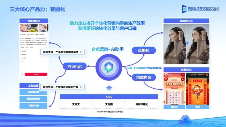 另一方面,借助文生文、文生图、内容风格化等AIGC方向的AI大模型能力,腾讯企点营销也将升级AI助手能力,助力企业提升个性化营销内容生产效率,获得更好的转化效果与客户口碑。
