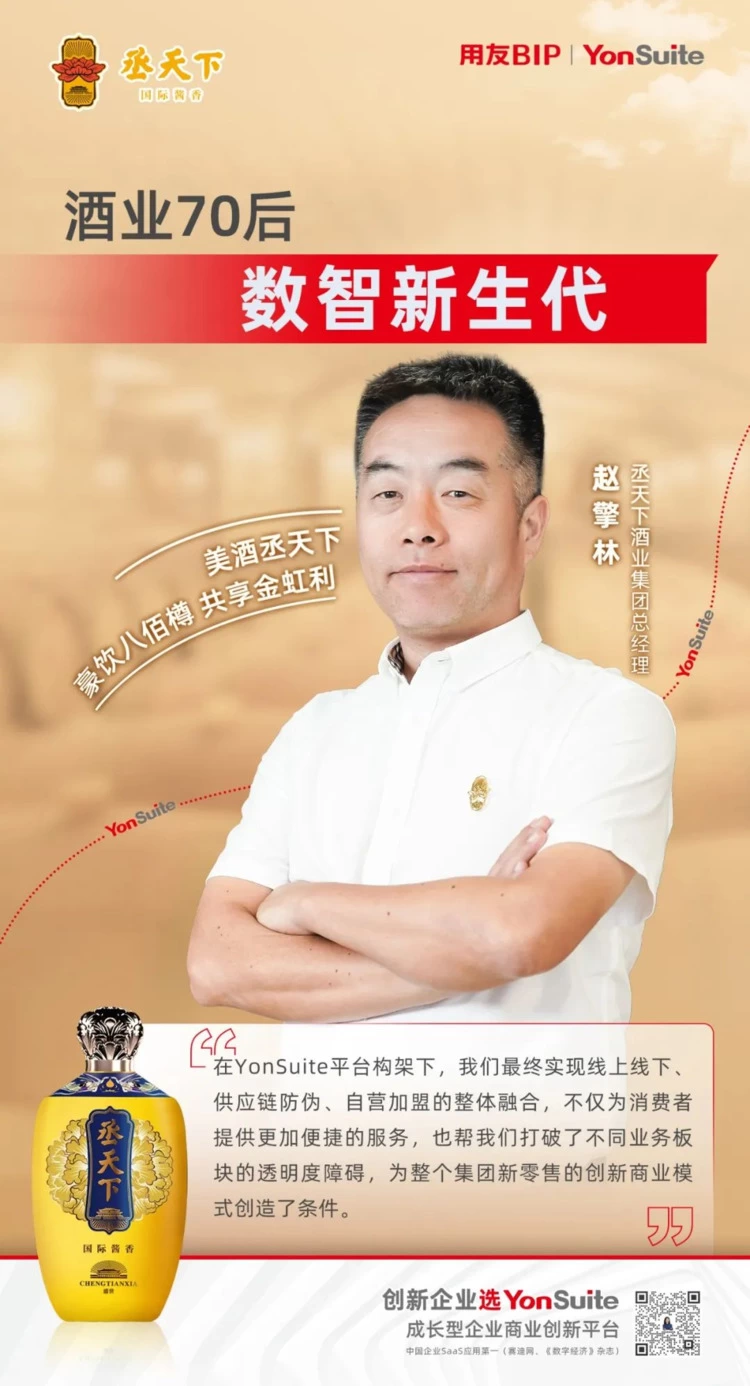 2022年,白酒行业创新企业丞天下全面上云,借助用友YonSuite全场景SaaS实现了白酒保真防伪与供应链一体化、B2C/B2B交易一体化、线上线下一体化、全渠道会员一体化运营、智慧财务等多个一体化管理及业务场景。据统计,这些数智化一体化场景的应用,提升了丞天下的业务处理效率69%、营收实现80%以上增长、财务自动化效率提升100%,从而实现新零售模式的成功转型。
