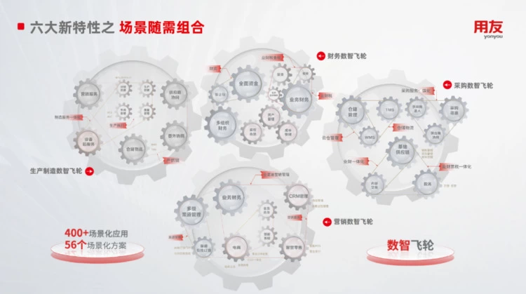 基于一体化的YonSuite成长型企业商业创新平台,企业可以将每个数智化场景看作是一个飞轮,它们之间相互关联,形成一个紧密联系的系统。当每个场景得到了充分发展和加强,它们就会形成一个巨大的飞轮效应,从而推动整个平台化数智系统的增长和发展。相对单一领域SaaS,全场景SaaS就显示出强大的“飞轮效应”优势。