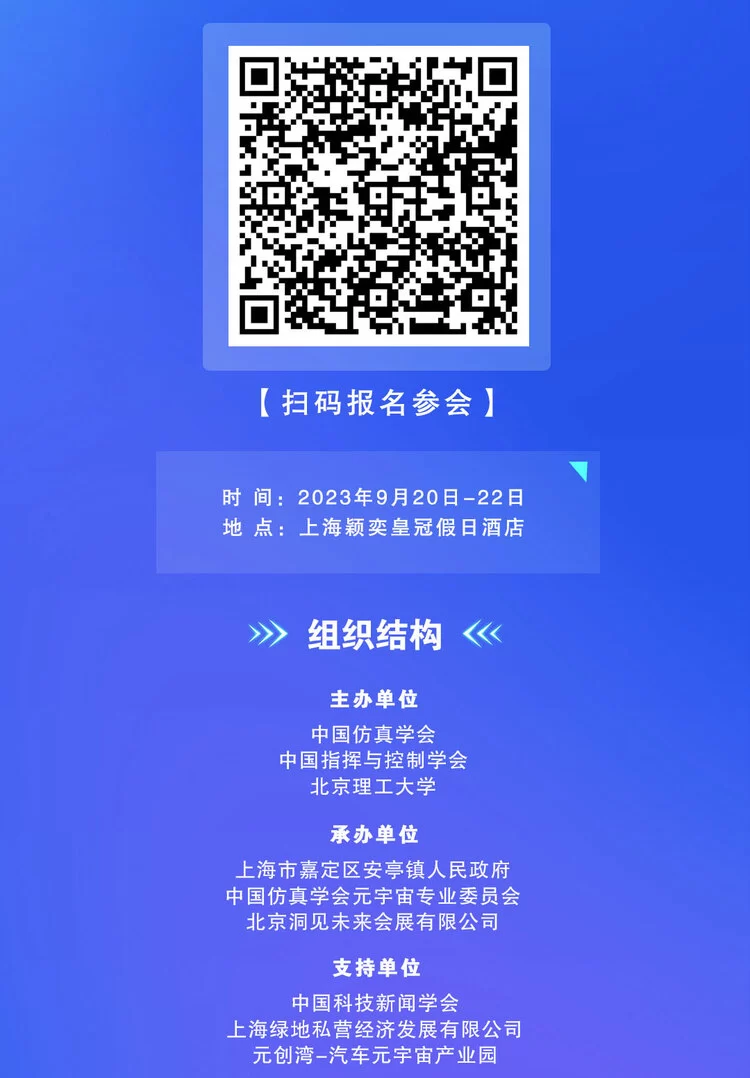 为深入贯彻落实发展数字经济的战略部署,紧抓《上海市建设具有全球影响力的科技创新中心“十四五”规划》和《上海市“元宇宙”关键技术攻关行动方案(2023—2025年)》契机。由中国仿真学会、中国指挥与控制学会和北京理工大学共同主办,上海市嘉定区安亭镇人民政府和中国仿真学会元宇宙专业委员会承办的第二届世界元宇宙大会将于2023年9月20日-22日在上海安亭举行。