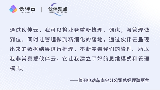 “通过伙伴云的设置,我可以将业务重新梳理、调优,将管理做到位。同时让管理做到精细化的落地,将管理中存在的问题通过数据暴露出来,通过伙伴云呈现出来的数据结果进行推理,不断完善我们的管理。所以我非常喜爱伙伴云,它让我建立了好的思维模式和管理模式。”魏总表示。