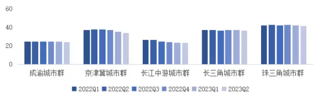 图 1 五大城市群2022年Q1~2023年Q2物流地产平均租金情况