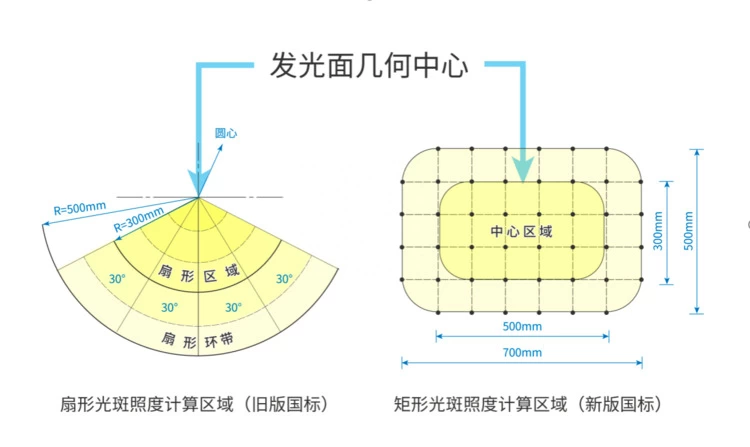 而新国标的有效照明区域为700mm*500mm的矩形总区域,其中500mm*300mm的区域被定义为中心区域。