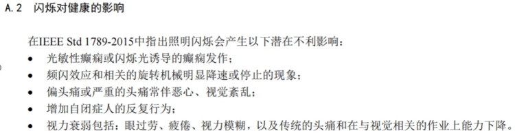 光闪烁会引发多种健康危害,甚至是光敏性癫痫或癫痫发作,旧版国标中,对于光闪烁的危害也有注释。