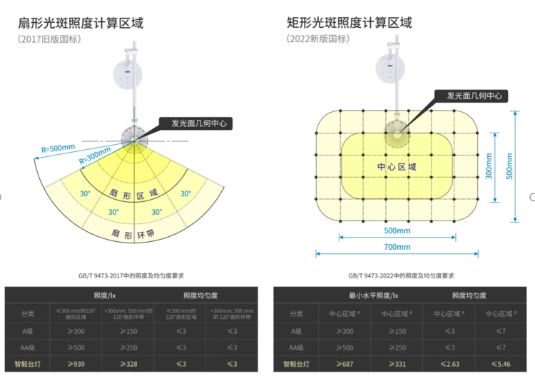 新国标的矩形计算区域更大,其面积是扇形计算区域的1.34倍。意味着在相同的照射高度下,符合新国标的护眼台灯能覆盖更大的桌面,覆盖的面积大就更舒适、实用。