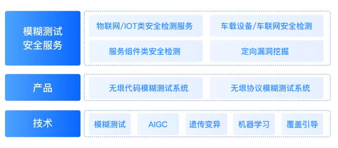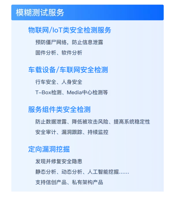 依托服务团队十余年安全行业的经验积累,云起无垠为企业带来了创新性的智能模糊测试服务,其中涵盖物联网/IOT类安全测试服务、车载设备/车联网安全检测、服务组件类安全检测及定向漏洞挖掘服务,帮助企业构筑更完善的安全防线,提供更全面的安全解决方案。