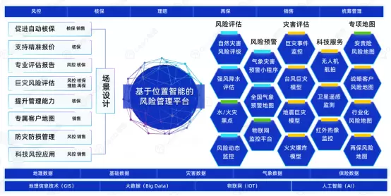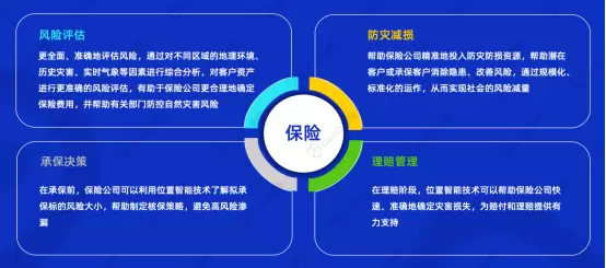 位置智能在金融保险各类业务上也有广泛应用,最常见的4种场景即为风险评估、防灾减损、承保决策、理赔管理。