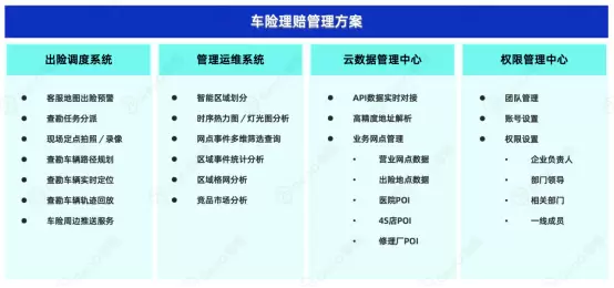 基于位置智能的车险理赔管理系统大致可分为出险调度系统、管理运维系统、云数据管理中心、权限管理中心四大功能模块。