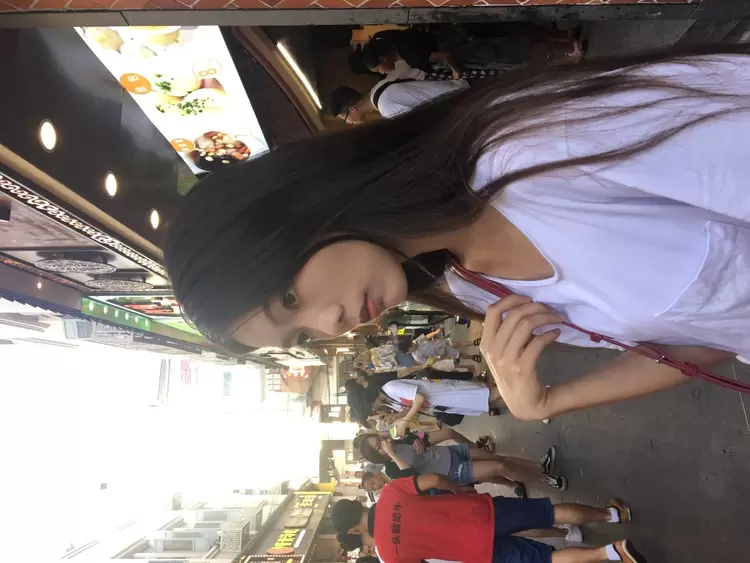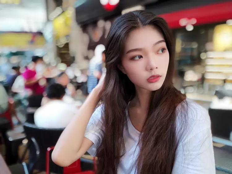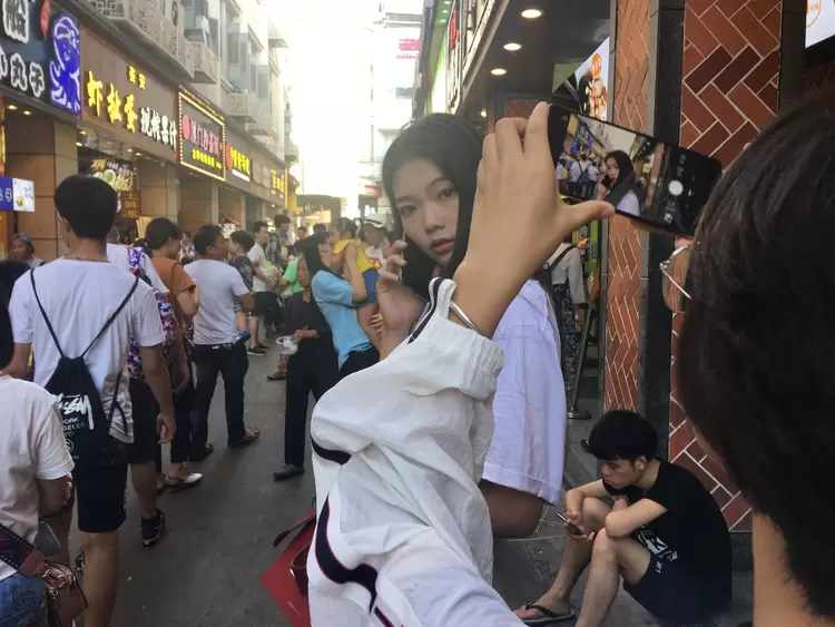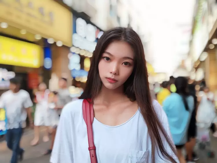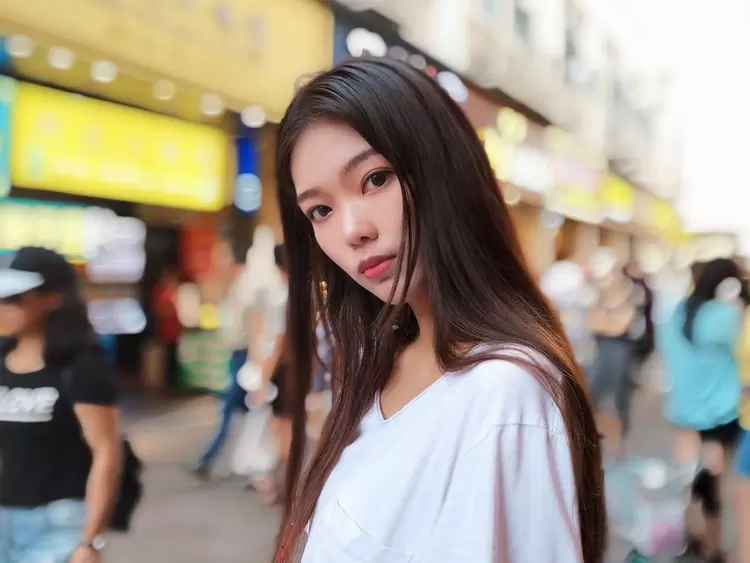 比如下图的这张照片,过往的行人较多,门店的招牌样式也各不相同,使得画面整体十分杂乱、难分主次。镜头中,身穿白色上衣的黑长发小姐姐就有两位,本该是“主角”小姐姐不仅被淹没在了背景的人海洪流中,更是被拍得灰头土脸。
