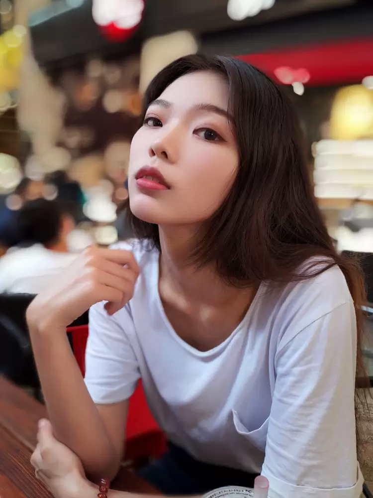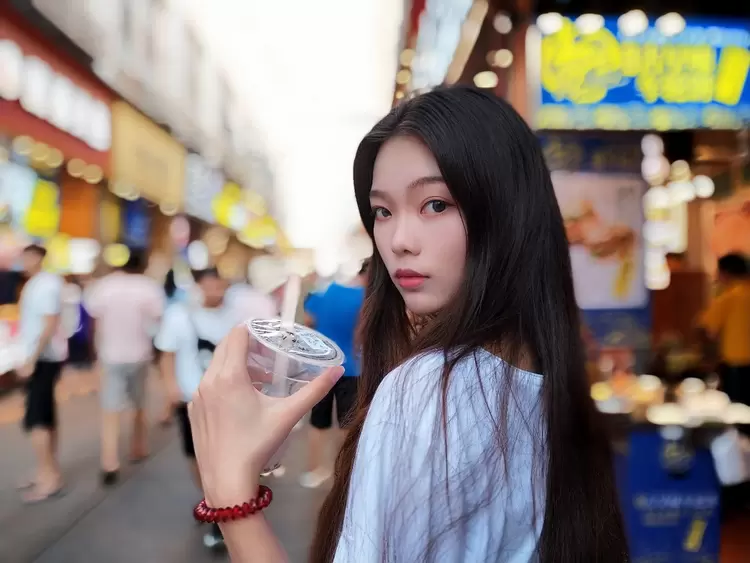 下面这几张堪比MV画面的照片,就是在美图T9的电影人像模式下拍摄的,实在是难以相信竟和上面几张照片是在同一个地点拍的同一个女孩。背景中的行人和门店招牌都恰到好处地被虚化成了背景,明亮的配色搭配柔和的光斑让背景看起来更加高级却不抢镜,谁是主角一目了然。