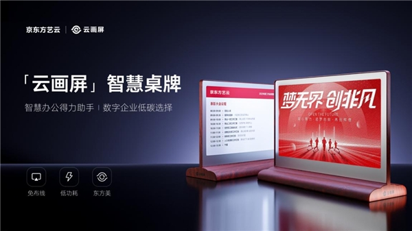 京东方艺云从办公桌牌入手,创新智慧新品,革新办公体验。在传统的会议接待中,纸质桌牌制作繁复,一次性使用,不仅降低工作效率增加成本,也不符合低碳环保理念。记者注意到,在此次大会上嘉宾席桌牌全部采用了京东方艺云首发的“云画屏”智慧桌牌。