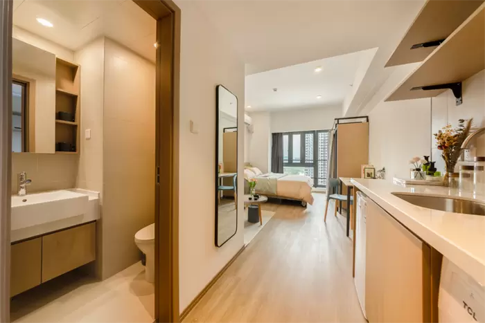 公寓为租客提供了37平米的“阳光单房”、41平米的“简约单房”、43平米的“温馨单房”以及49/50平米的“舒阔一房一厅”;·房间内配置品牌家电家居、全景落地玻璃窗,收纳无限海景的同时,拥有超宽裕收纳空间和独立卫浴;·在公区的打造上,接待区、洗衣房,会议室、阅读室等一应俱全。