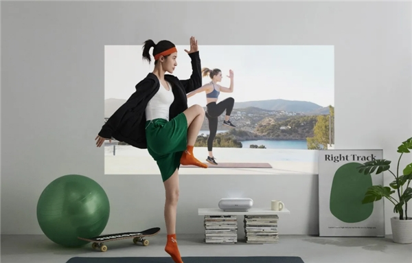 尤其是在超短焦赛道上,坚果投影突破超短焦技术,将其从价格高昂的激光电视上拉入家用投影之中,让行业内外更多人看见了投影行业的未来方向。这是因为,超短焦投影相比传统长焦,在很多方面都有优势,比较明显的优势就有:不受使用空间限制,免安装免调试,免干扰不怕遮挡,⾳画同源,无侧投不会产生亮度损耗等。尤其是超短焦的超小投射比,突破了传统投影仪需要距离墙面2m以上的使用限制,只需要距离墙面一尺左右的距离,就能轻松投出百吋大屏画面,清晰无干扰。更是由于投影仪摆放靠近墙面,让用户在使用上更加轻松自由,比如可以轻松在家跟跳最近大火的刘畊宏健身操,不用担心因为运动移动身体而产生的遮挡投影光线问题。