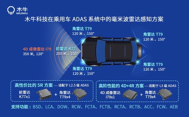 针对乘用车市场占比较高的L2级及以上ADAS系统,木牛科技提供了两套5R方案,其中高性价比版是前向雷达x1+角雷达x4;而高阶性能版是4D成像雷达x1+角雷达x4。无论哪一种方案,均已达到业内最佳性能,都能提供点云层级、目标层级和功能层级的信号输出。
