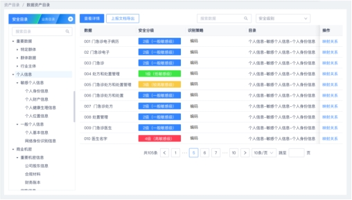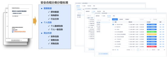 分类分级标准是实现资产类别及安全等级准确、规范划分与确认的依据。在持续摸索和实践沉淀中,美创科技结合《数据安全法》和《个人信息保护法》等法律法规,以及在众多行业分类分级标准的解读、整理,将其转化至产品当中。