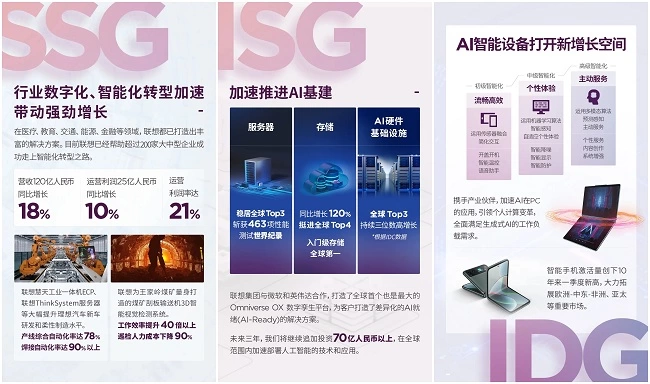 业绩表现:受多重市场环境影响,ISG营收为134亿人民币,同比下降8%。可持续增长:联想集团将全方位投资于AI基础设施的研发创新,包括开发AI边缘计算、混合云,以及支持AI工作负载的服务器和存储等。ISG将坚持扩展视野,目标成为客户数智化转型最可信赖的基础设施合作伙伴。