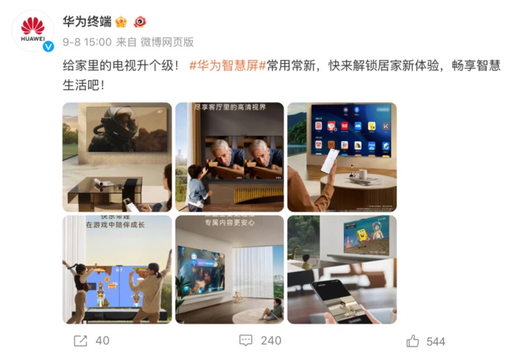 2023年9月8日,@华为终端官方微博正式宣布,华为智慧屏全系在售产品迎来重磅升级。据悉,此次华为智慧屏在娱乐、健康、关怀以及畅连四大板块进行了全面升级,旨在为用户带来“常用常新”理念下的系统、功能以及内容的智慧生活体验增值。