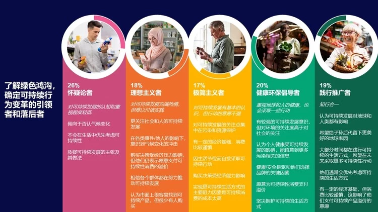 4)虽然企业必须立即采取行动加速供给侧转型,开启可持续发展新征程,但并非所有品牌和消费者都已做好准备。占比19%的践行推广者代表了可持续消费的未来状态,但了解其他四个细分群体的动机和驱动因素对于可持续转型至关重要。