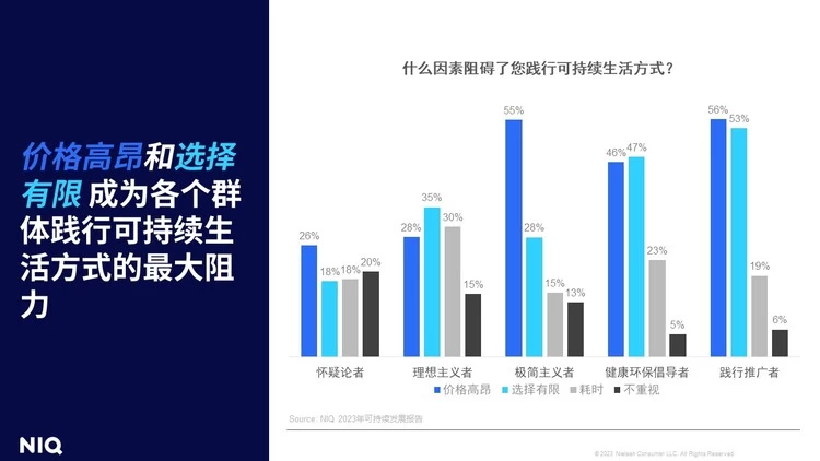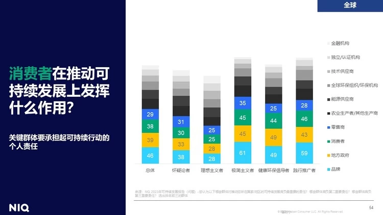 在消费者方面,38%的消费者认识到自己对可持续发展中具有推动作用,这一认识在践行推广者、健康环保倡导者和极简主义者的比例较高。
