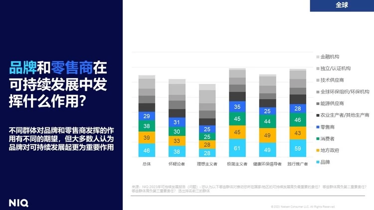 品牌和零售商要怎么做才能满足消费者不断提高的期望?报告指出,76%的全球受访者认为企业主动减少环境足迹对他们来说十分重要。不同群体对品牌方和零售商发挥的作用有不同的期望,但大多数人认为品牌方对可持续发展起到更为重要的作用。
