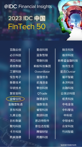 近日,全球权威知名市场调研机构IDC正式公布“2023 IDC中国FinTech 50”榜单,金蝶信用科技(深圳)有限公司(简称金蝶信科)凭借成熟的金融科技实力,连续入选榜单。