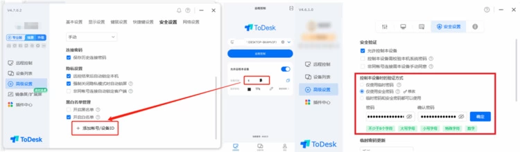 如果想要更进一层的进行安全设置,还可通过开启黑、白名单这项措施来帮助远程连接的万无一失。开启黑名单意味着名单内账号/设备不允许控制该设备,开启白名单是意味着仅名单内账号/设备允许控制该设备。