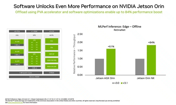 在另一个体现边缘计算领导力的例证中,NVIDIA Jetson Orin模块化系统将边缘AI和机器人应用场景中常见的计算机视觉用例——目标检测的性能比上一轮测试提升高达84%。