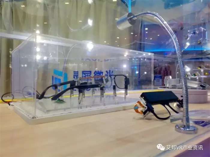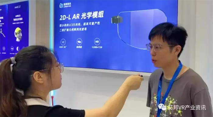 在我们的展台上就可以看到现在的这个样品的体积就跟普通眼镜非常类似了。同时灵犀微光还搭配了设计升级之后的LCoS像源照明结构,保证了模组在极致控制体积的同时,其亮度、对比度和功耗都能达到比较平衡的水平。